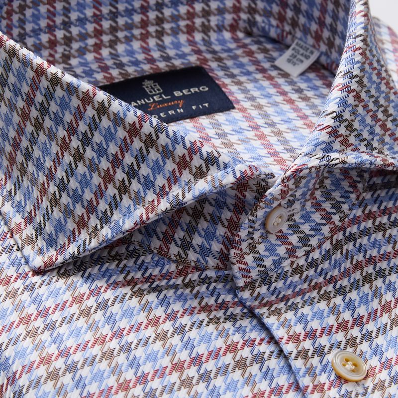 A bold interpretation of a menswear staple, this houndstooth shirt stands out with its vibrant red palette and soft twill texture. 100% Cotton