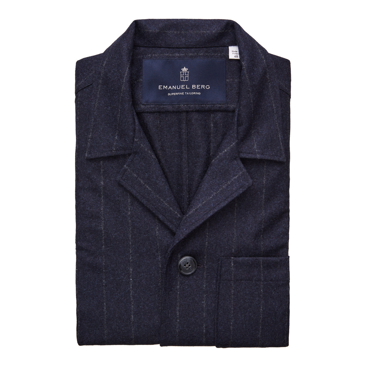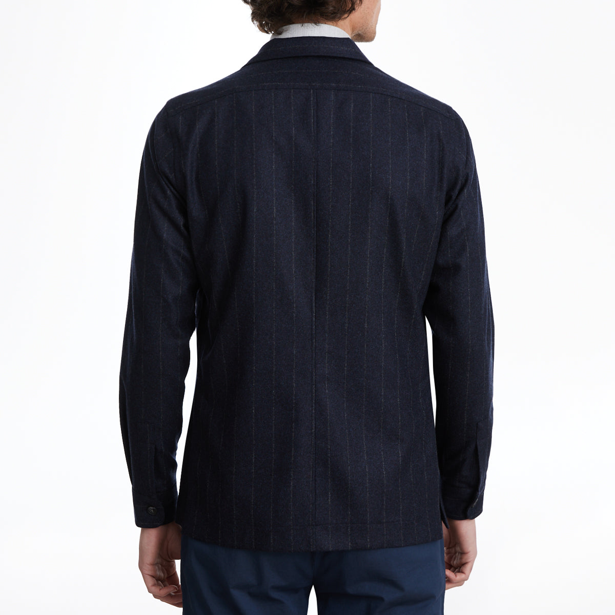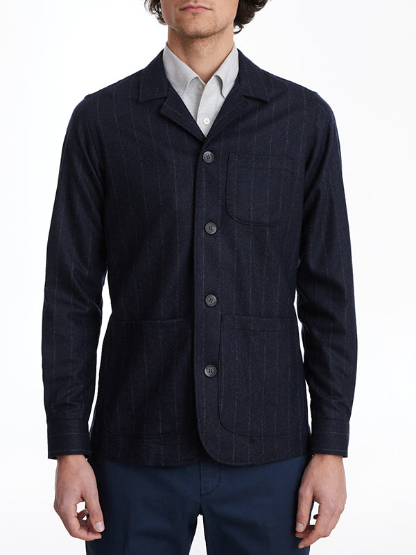 This elevated shirt jacket features a refined wool stripe pattern and a softly tailored, unlined construction for a relaxed yet sophisticated silhouette. Perfect for transitional layering, it merges shirt-like comfort with outerwear polish.