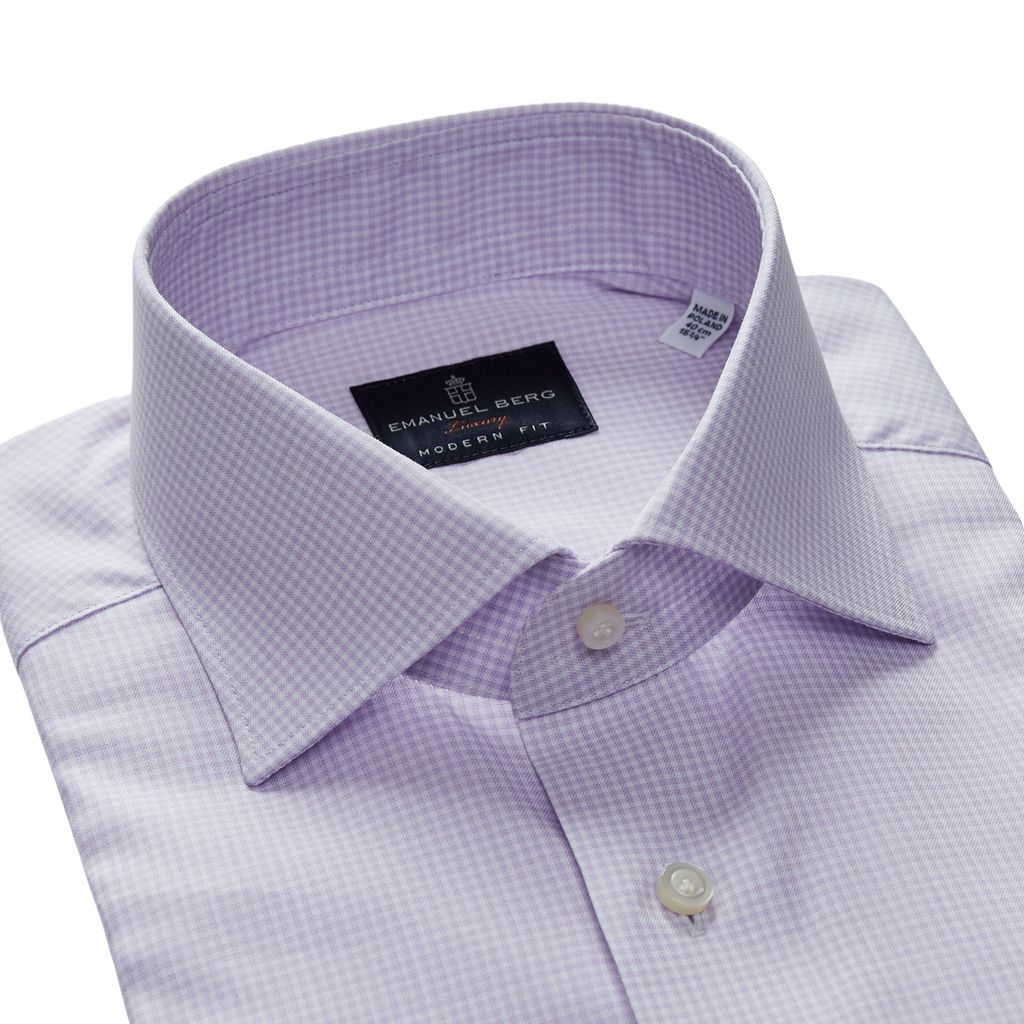 This white and violet check Natural Stretch Yoga Twill Premium Luxury Dress Shirt comes with our Rialto collar and matching white buttons.