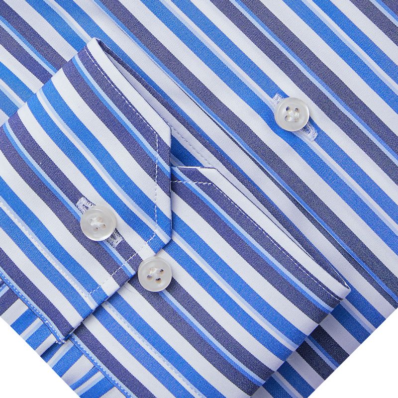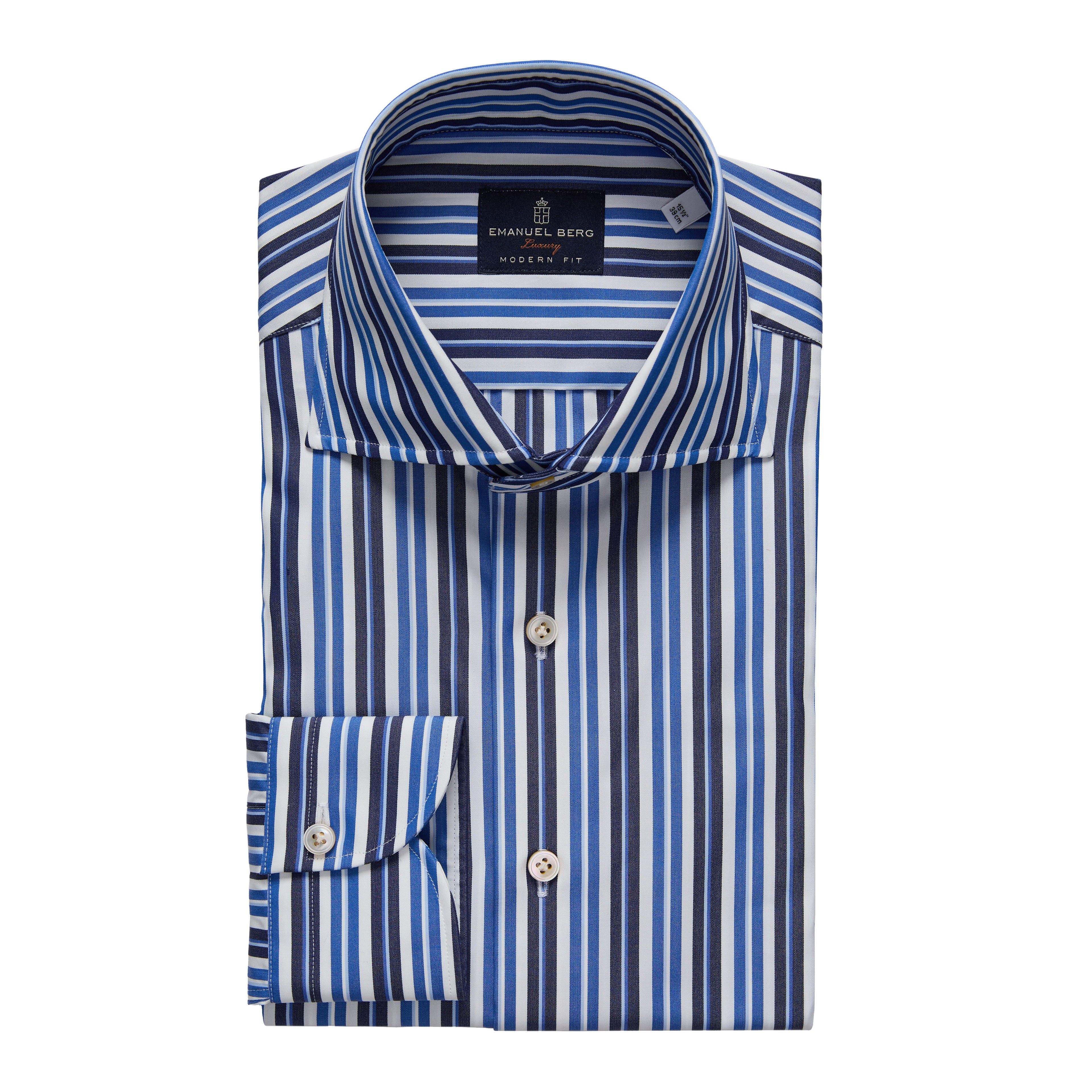 A timeless staple, this blue striped shirt is tailored from crisp poplin for a polished finish. Its modern fit silhouette ensures versatility, making it ideal for both business and casual settings.