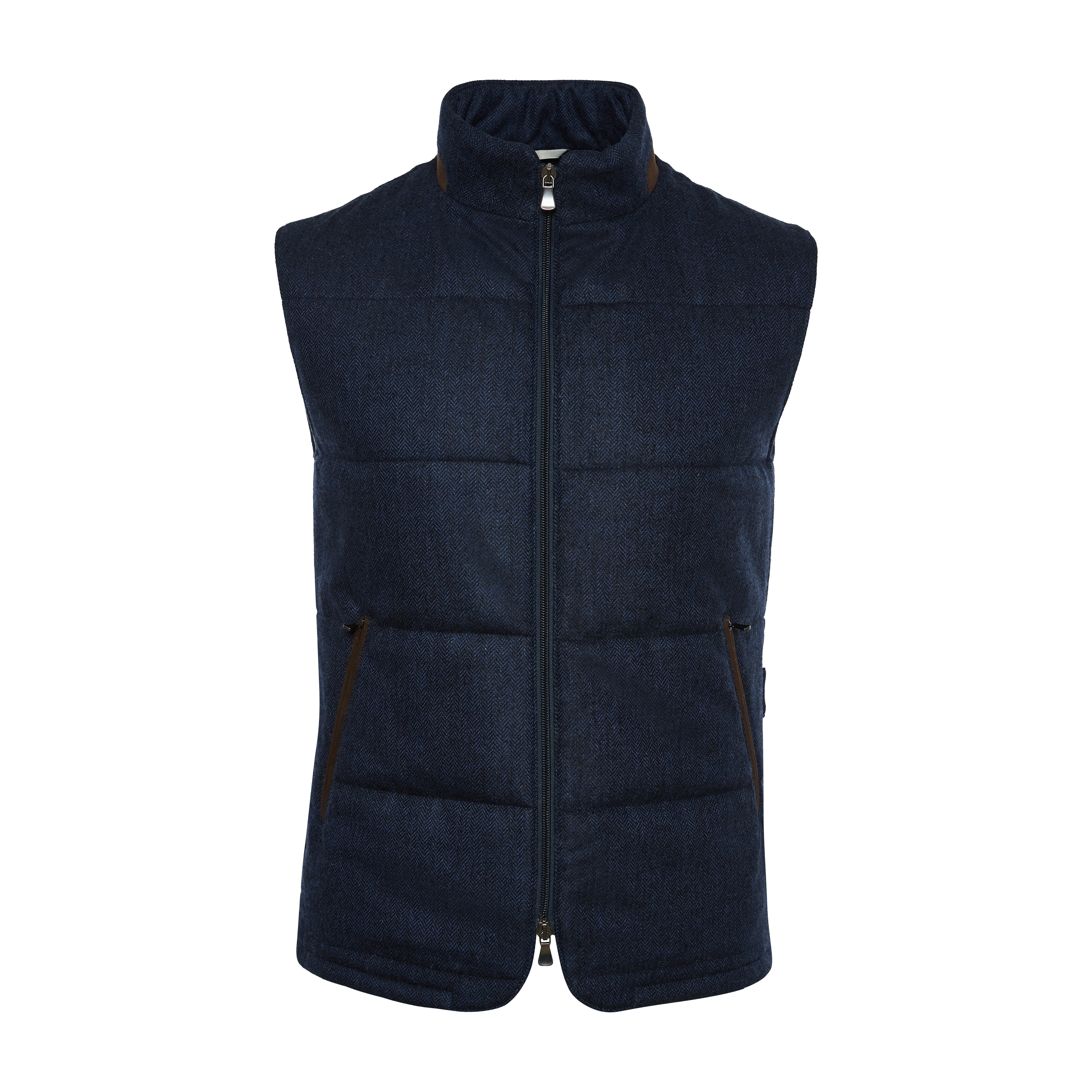A tailored layering piece for cooler days. Woven from a luxurious wool blend in a refined herringbone weave, this vest delivers lightweight warmth with timeless polish — perfect over a knit or under a jacket.